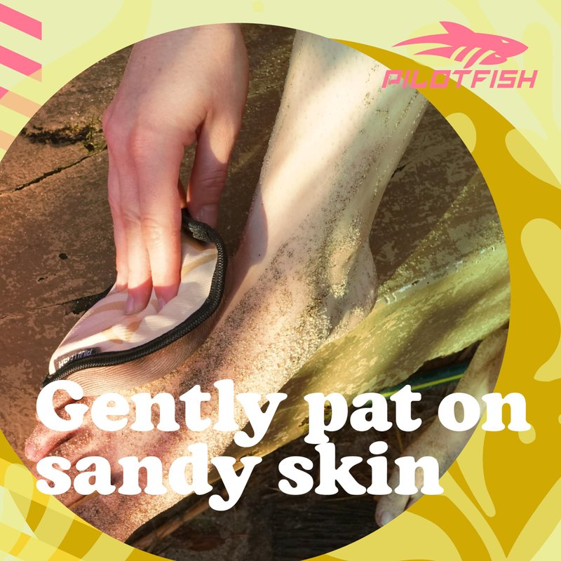 The Pilotfish Stardollar sand remover bag is designed to help you avoid the uncomfortable feeling of sticky, gritty sand clinging to your skin. The sand removal powder bag is a game-changer for beachgoers of all ages as a wet sand remover.