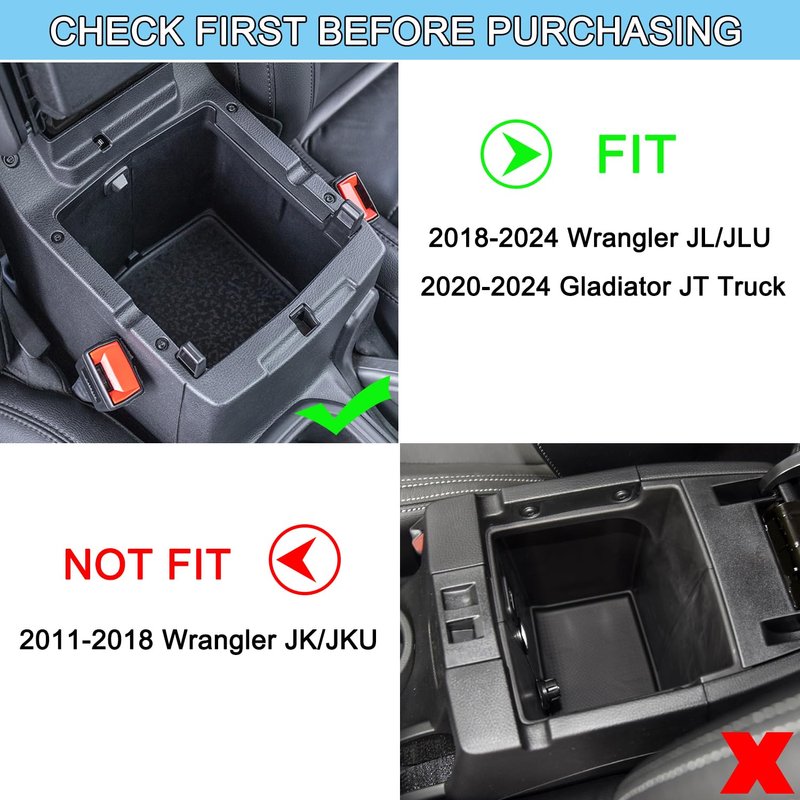 - FITMENT: This center console tray fits for 2018 2019 2020 2021 2022 2023 2024 Jeep Wrangler JL/JLU Unlimited and 2 doors, including Rubicon, Sport, Sahara, Moab. Also fits for Jeep Gladiator JT Truck 2020 2021 2022 2023 2024.