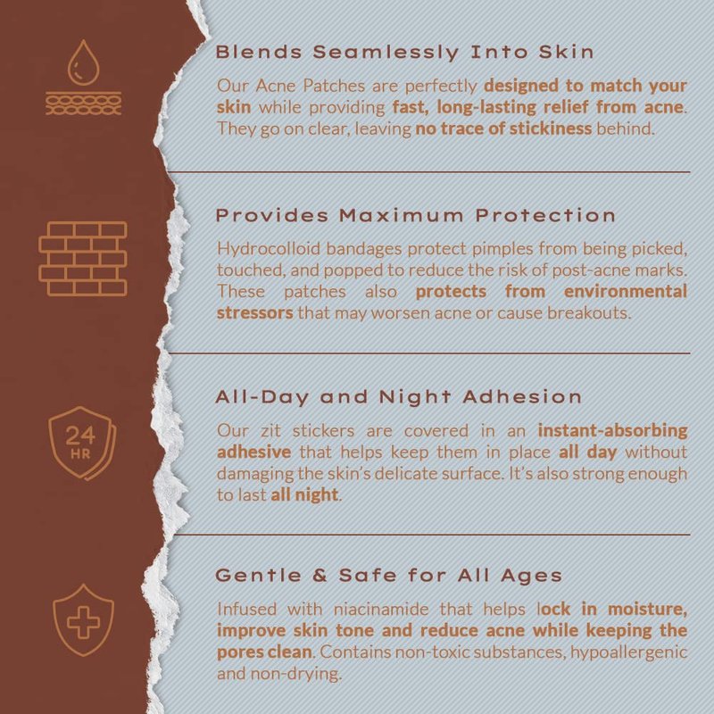- As an acne spot treatment, our acne patches provide long-lasting relief from acne & seamlessly blend in with all skin tones with their clear, matte finish & extra-thin outer edges. These pimple stickers also stay invisible under makeup, leaving no trace of stickiness behind.