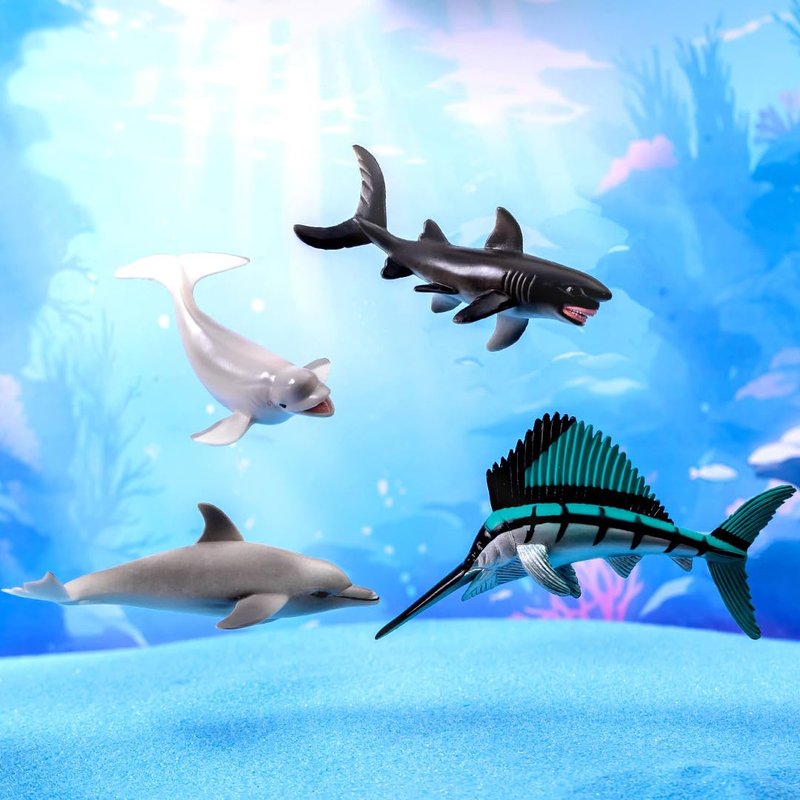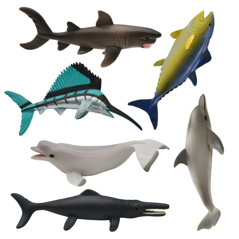 - Package: Pack of 6 pieces 6 different mini sea fish figurines(includes white whale, shark, dolphin, swordfish, tuna, Temnodontosauridae)