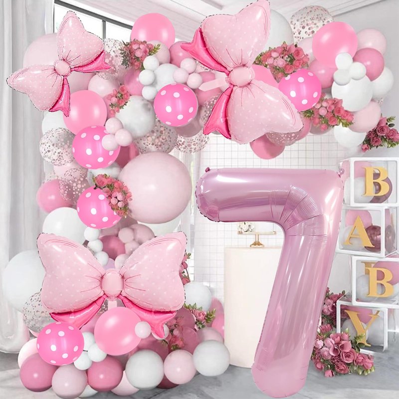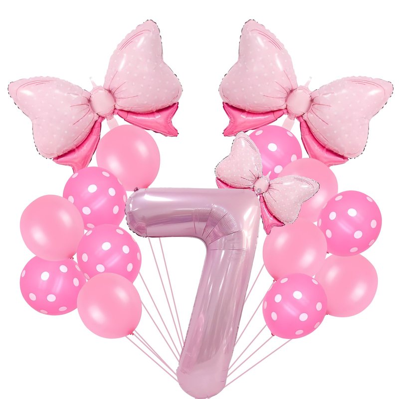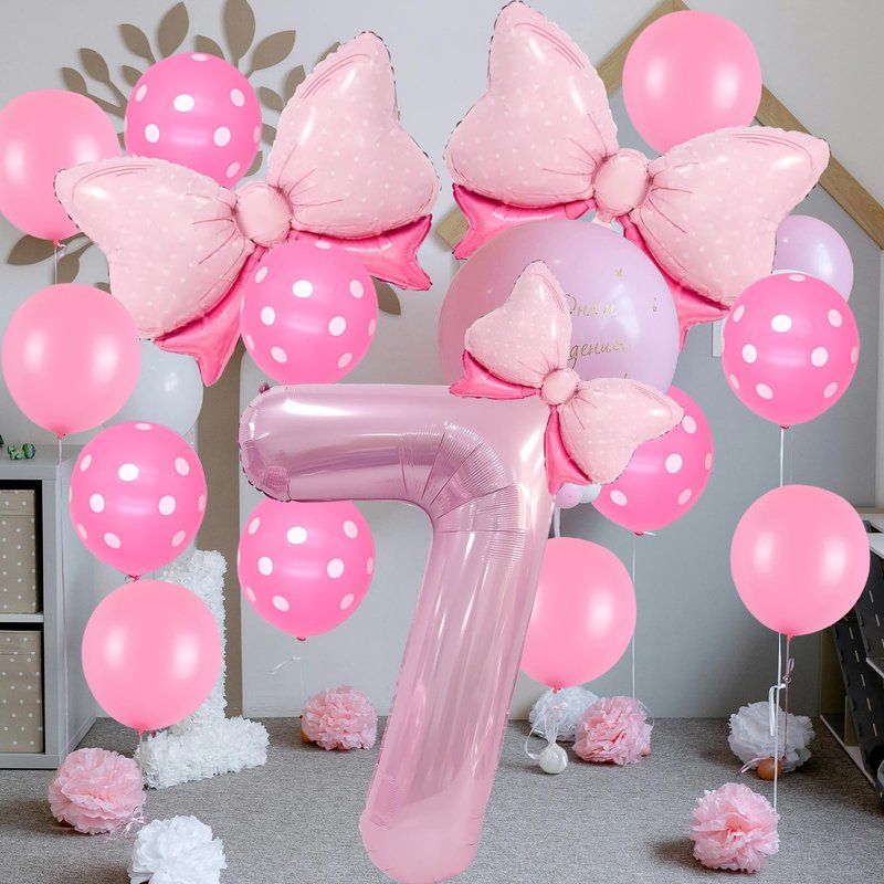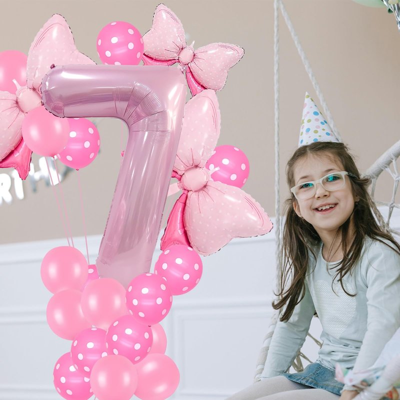 - Bow Birthday Party Supplies: This Bow Balloon 7 th birthday party supplies set includes a giant 40" number 4 balloon, 2 pcs 27*20" and 1 pcs 16" Bow balloon, 6 pcs 12“ Polka dot balloon, 6 pcs 12" Pink Balloons