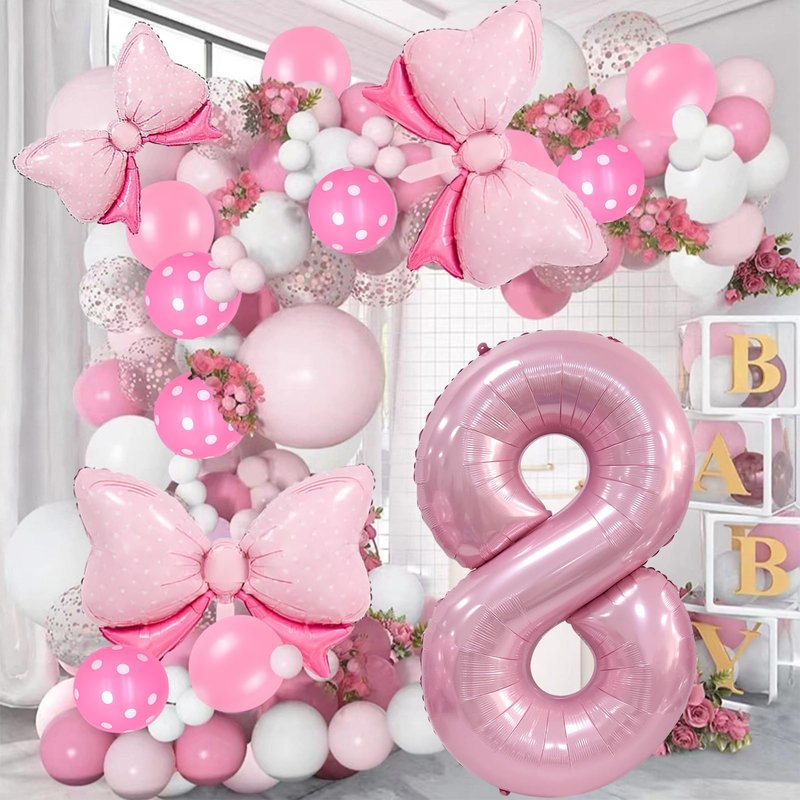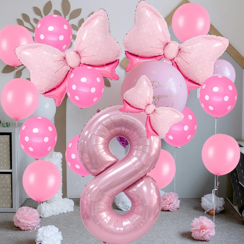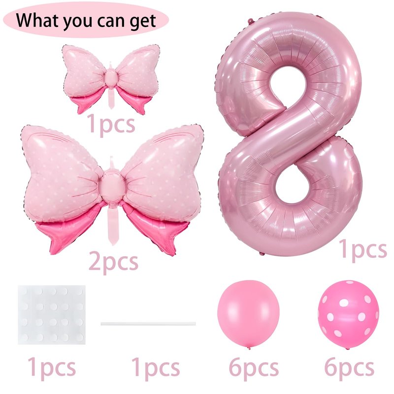 - Bow Birthday Party Supplies: This Bow Balloon 8 th birthday party supplies set includes a giant 40" number 4 balloon, 2 pcs 27*20" and 1 pcs 16" Bow balloon, 6 pcs 12“ Polka dot balloon, 6 pcs 12" Pink Balloons