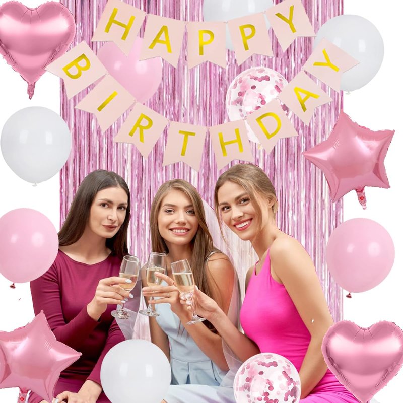 - PRETTY GIRL BIRTHDAY DECORATION: The pink birthday decorations package is such a beautiful color! There are stunning pink white balloons for making a balloon arch. pink fringe curtain make a decoration wall, pink white confetti balloon and happy birthday banner supplies all included. the pink white are also very agree with women's themes. I believe our pink birthday party decoration will definitely become the focal of your party!