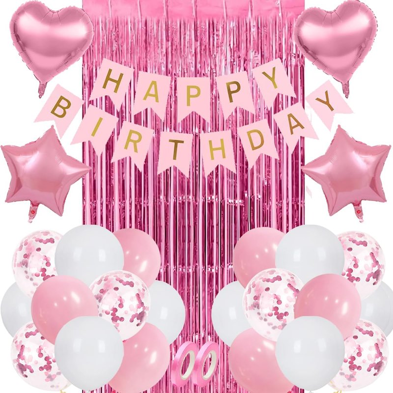 - PINK BIRTHDAY PARTY DECORATION: 1 x happy birthday banner, 1 x pink fringe curtain(3.2 X 6.5ft), 4 x pink foil balloons (heart and star), 10 x pink confetti balloons, 20 x pink balloons, 20 x white balloons, 1 x balloon glue dot (100pcs dots in total), 2 x pink ribbons(66ft in total). enough to decorate a luxurious party!