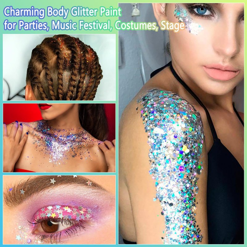 - 【Pretty Sparkle Glitter Sequins】 Our body glitter gel sparkles brilliantly when applied to the face and body, creating a magical effect. This chunky glitter eyeshadow is adorned with tiny sequins and larger sparkles that glow in a range of holographic hues, shining brightly in the light. Show your beauty on your skin for cosmetic grade glitter at any event. This makeup glitter for enhancing your face, body, and hair, adding a touch of glamour and fun.