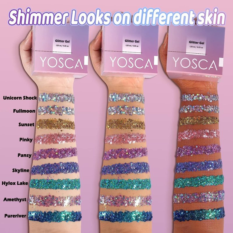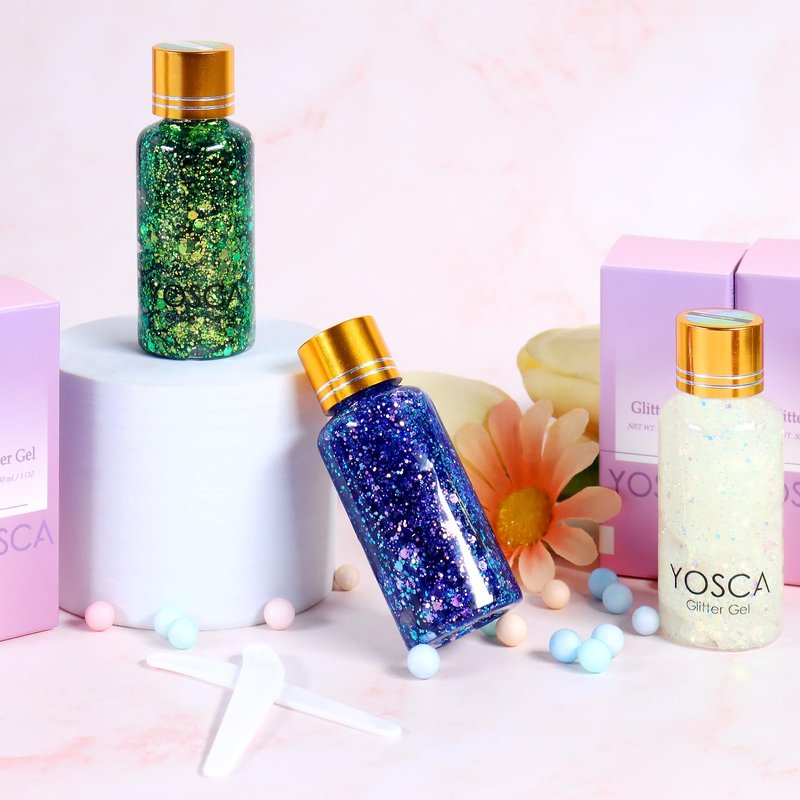 - 【Easy-to-use Body Glitter Gel】Yosca mermaid makeup glitter gel is a breeze to apply, with its fairy-like sparkle tailored for women. Just dispense a generous amount of the mardi gras glitter gel onto the cosmetic applicator and evenly spread it across your desired area. This nail glitter gel boasts quick-drying features, ensuring a captivating sparkle that lasts throughout the night. Removing the slime glitter is effortless with a gentle rinse of warm water.