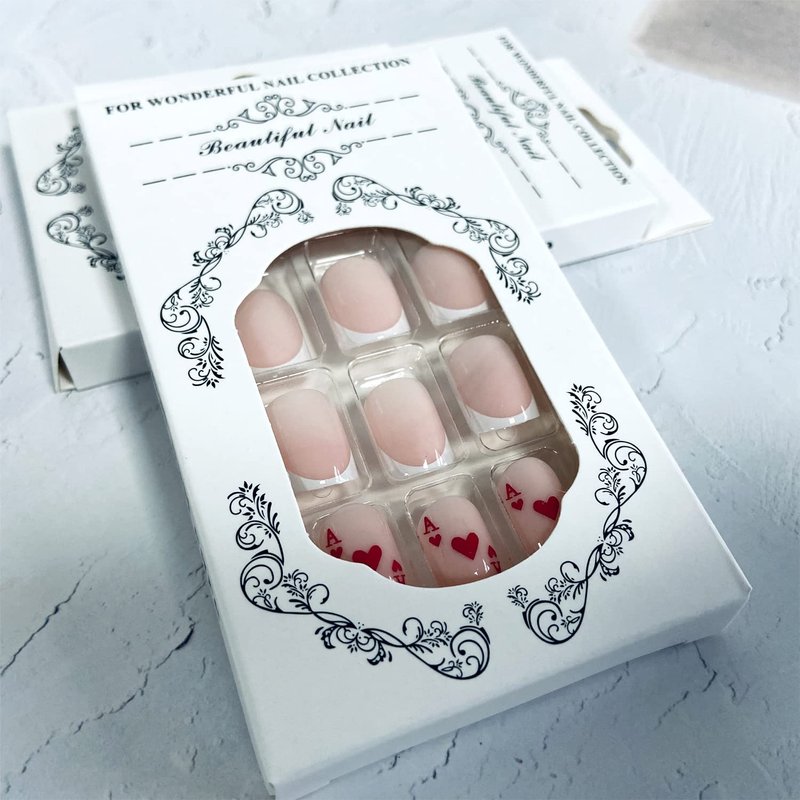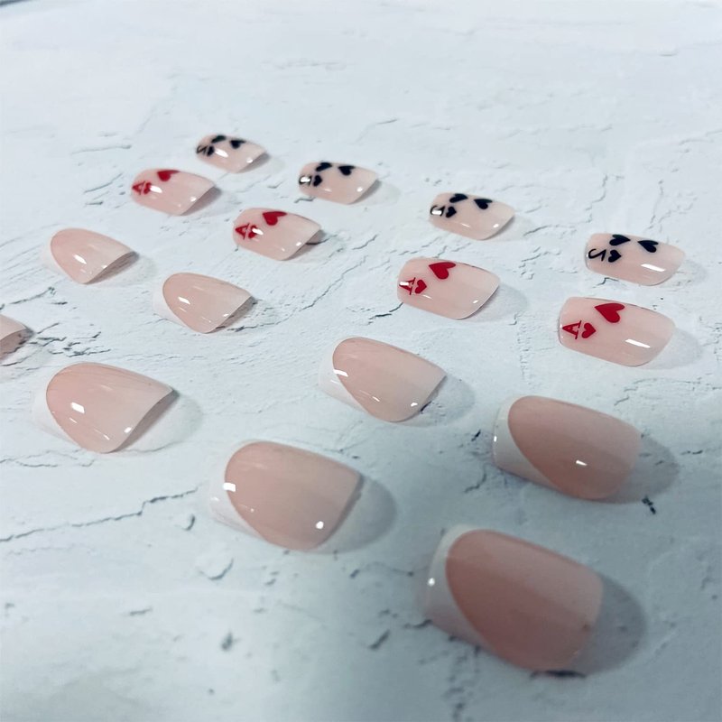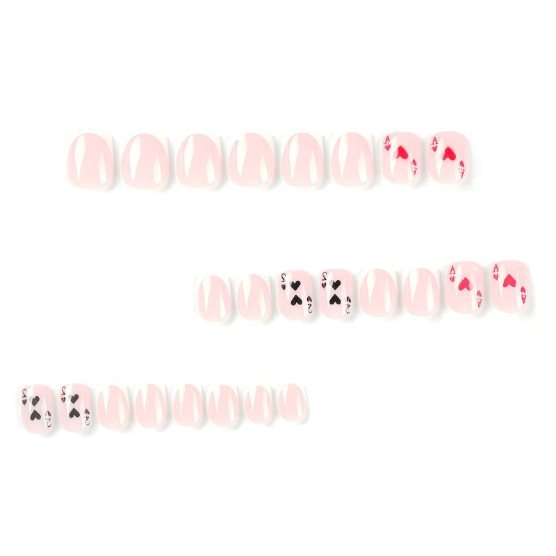 24Pcs Press on Fingernails, Ladies Pink French Tip Square Short Length False Nails , Spades 2 and Ace of Heart Designs Artificial Fingers , Party, Nail salon, Holiday Nail Art Decorations