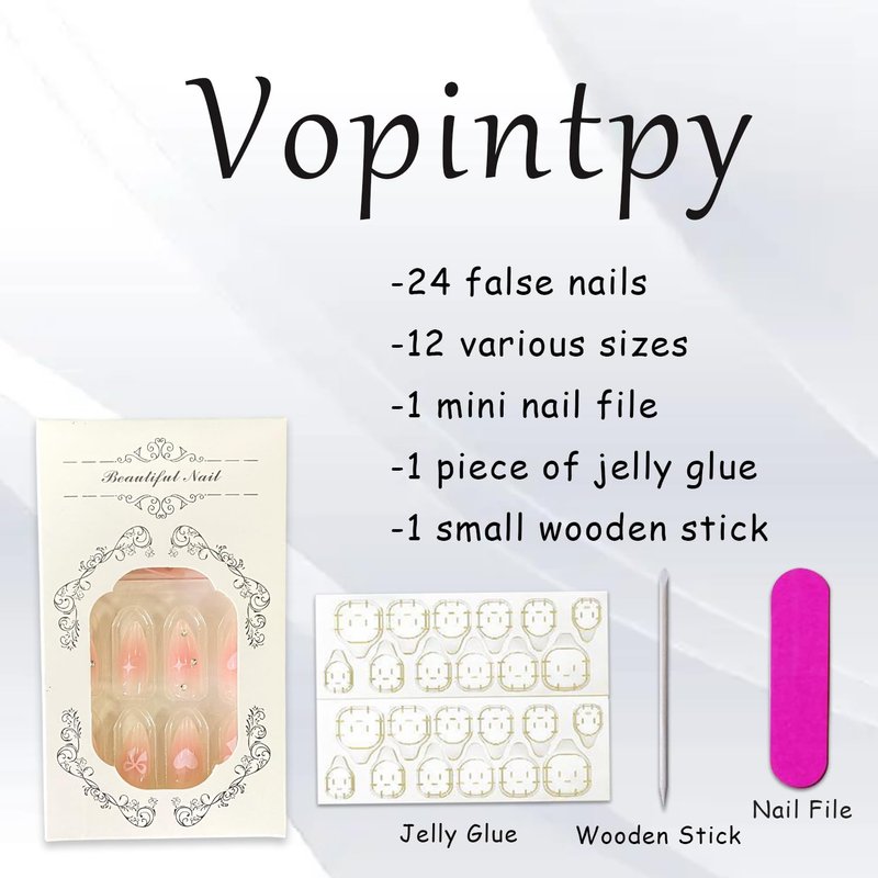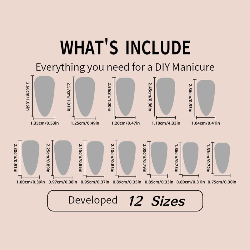 - 【Package & DIY Nails】You'll get 24 false nails in 12 sizes. 1 mini nail file, 1 small wooden stick, 1 piece of adhesive tab glue. You can safely choose a fake nail that fits your finger size and DIY your desired nail shape.