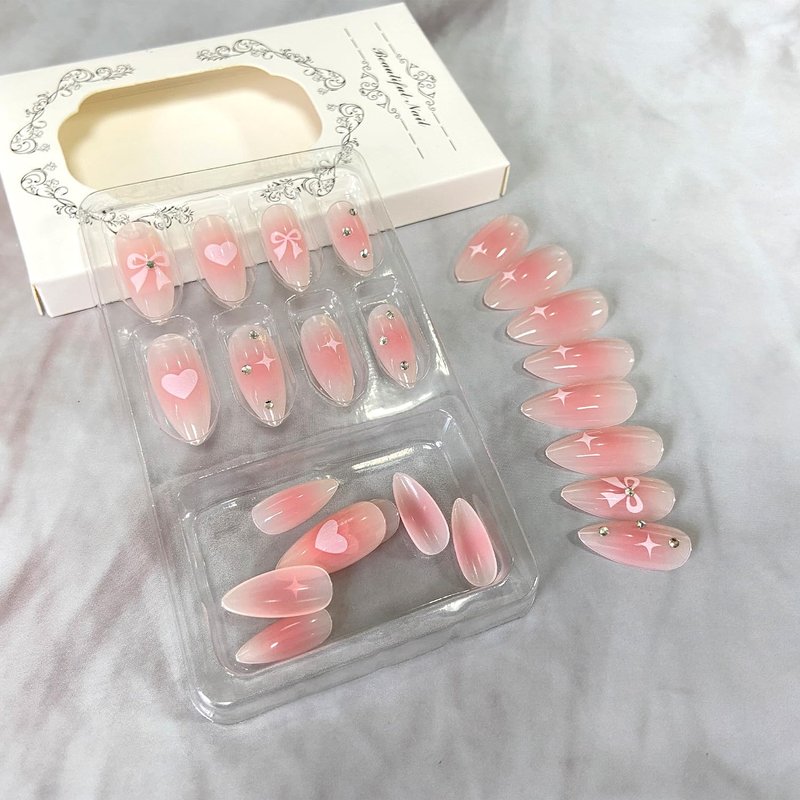 24 Pcs Pink Bow Heart Design Press on Nails Long Almond Shape Fake Nails Set for Women Manicure Decorations
