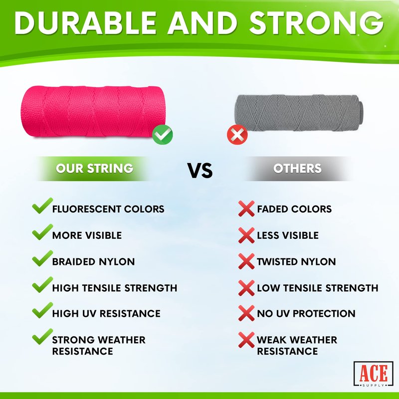 - Strong string - This thick string is made of high quality nylon, which is stronger than polypropylene twine. The braided design allows this marking rope to hold up through the harshest conditions!