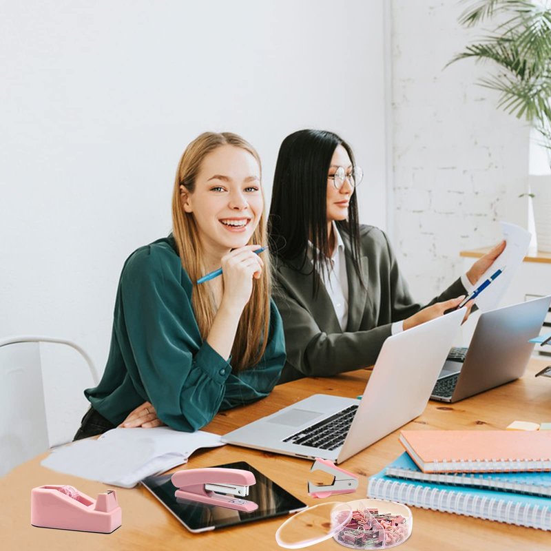 - Package Includes- This pink office supplies contains 1x Stapler, 1x Staple Remover, 1000x Staples, 1x Tape Dispenser, 1x Office Scissor, 20 x Push pins 7 x Big Clips 15 x Small Clips 30 x Paper Clips, 10 colors Tabs with ruler. Such a complete pink desk accessories combination is enough to meet your school and office using needs.