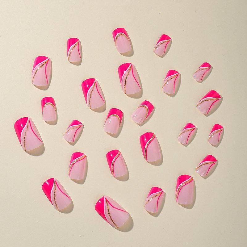 Pink Press on Nails Short Square Fake Nails French Tip False Nails with Gold Glitter Line Designs Glossy Glue on Nails Full Cover Acrylic Stick on Nails Hot Pink Artificial Nails for Women Manicure