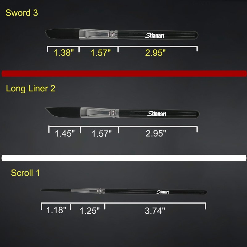Detail pinstripe brush Set: pinstriping Brush kit models include 1, 2, 3, 3 size Sdanart paint brushes can accurately draw extra-long strokes with smooth lines, Make it easy for you to draw professional and perfect effects High-quality bristles: the Pinstripe brushes are made of high-quality fine nylon bristles, which are excellent in absorbing pigments, and the brush strokes are able to complete the color line coating quickly and evenly,Achieve a painting effect like that of a squirrel brush Sword Striping Brush: The professional sword design is designed to provide the user with the best options while achieving excellent straight line and turning qualities. Pinstriping brushes: Designed for professional artists and beginners, Sdanart Pinstriping brushes make it easy to do Pinstriping Art and draw beautiful controlled lines