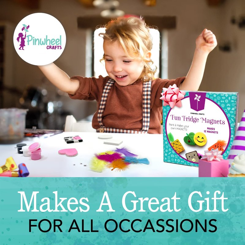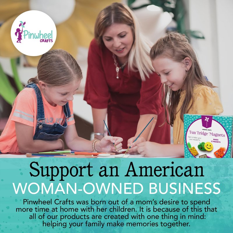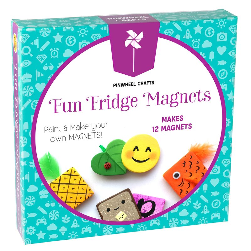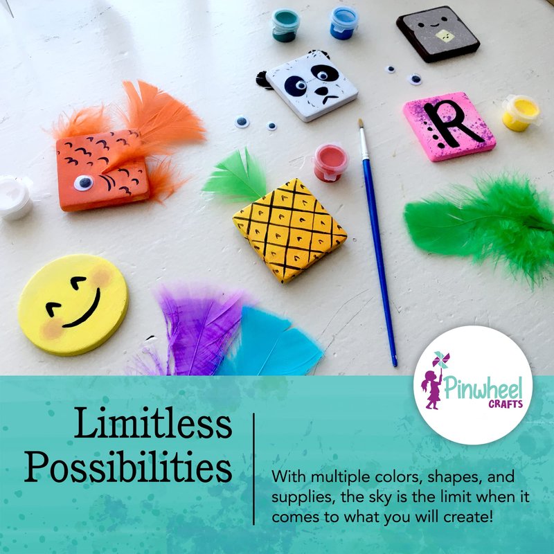 PAINTABLE MAGNETS A big part of the fun is getting to play with paint! The Pinwheel Crafts Magnet Kit comes with 8 acrylic paint pots along with a paint brush so you can color in your magnet, sign your name or even write a loving or inspirational message. Kids will have a blast decorating your fridge or the inside of their school locker with some cool crafts they made all by themselves! ADD EXTRA FLAIR Ready to really get creative? The set also comes with a few fluffy feathers and goofy googly eyes to let you add even more decor to the magnets. This DIY activity kit definitely lets your child’s creativity shine! How will you decorate yours? There are endless possibilities! FOR ALL AGES Pinwheel Crafts Magnet Kit is a perfect activity for kids birthday parties or playdates. It also provides you with an excellent opportunity to create art and bond with your child while making memories and cute little keepsakes, too! DIY MAGNET ART Looking for a new arts and crafts project for your kids to do on a rainy day or a random afternoon? Pinwheel Crafts Magnet Kit has you covered! Children will love turning these tiles into colorful fridge magnets they can admire every day or even give out as gifts. Self-adhesive magnet strips are included to make the tiles stick to a refrigerator, school locker or any other metal surface. 3 TILE SHAPES One activity set offers enough supplies for making 12 magnets. You can choose from 8 square tiles (2 x 2 inches), 2 round tiles (2 inches wide) and 2 heart tiles (1 ⅞ inches). - Pinwheel Crafts Fridge Magnets Kit - 12 Tiles (8 Square, 2 Round, 2 Heart) and 12 Adhesive Strips - 8 Acrylic Paint Pots and 1 Paint Brush - Feathers, Googly Eyes and Detailed Instruction