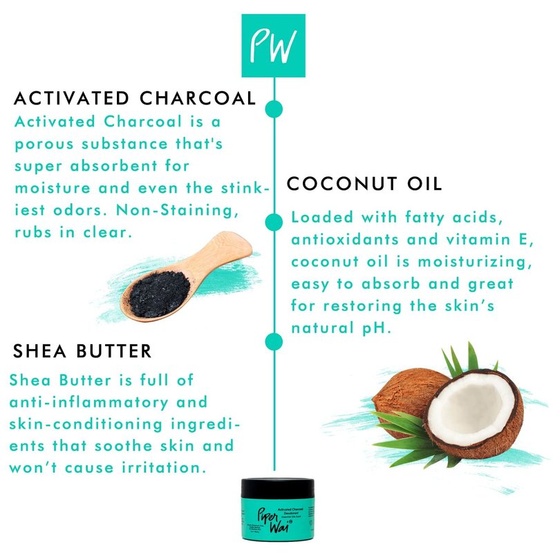 - ACTIVATED CHARCOAL: We’ve harnessed the power of activated charcoal to make our deodorant extra effective. Charcoal is a porous substance that's super absorbent for moisture and even the stinkiest odors. Rubs in clear, melts into your skin, won’t stain your clothes, and best of all, this natural deodorant will keep you smelling fresh all day long! Finally, a deodorant that provides long lasting odor protection without all the downsides.