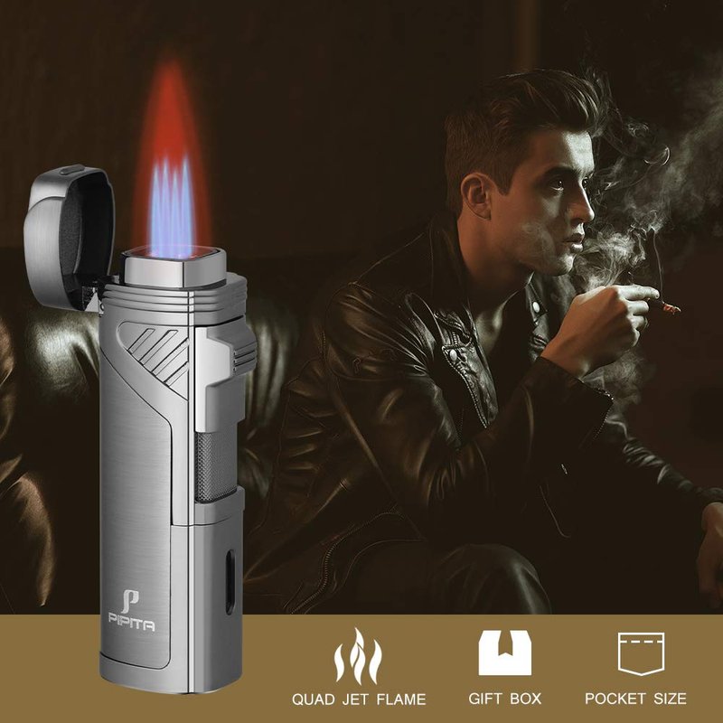 PIPITA Torch Lighter Windproof Cigar Lighter Jet Quad Flame Refillable Butane Cigarette Lighter with Punch (Without Butane Gas)