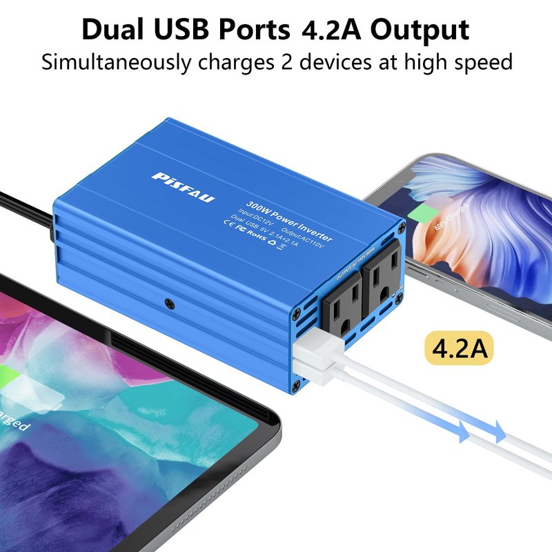 PiSFAU 300W Power Inverter 12V DC to 110V AC Car Plug Adapter Outlet Converter with 4.2A Dual USB AC car Charger for Laptop Computer,Road Trip Essentials Camping Accessories