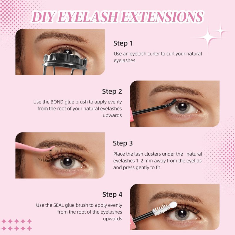 - โจใEasy DIY Eyelash Extensionsใ When pasting cluster lashes, first take out the bond-end glue brush head, brush upward from the root of the real eyelashes and apply evenly, use flat-head tweezers to take out the false eyelash clusters and paste them on the corresponding eyelash roots, press gently to make them fit correctly , then take out the seal-end glue brush head, brush upward from the root of the eyelashes and apply it evenly. Even beginners can easily master it.
