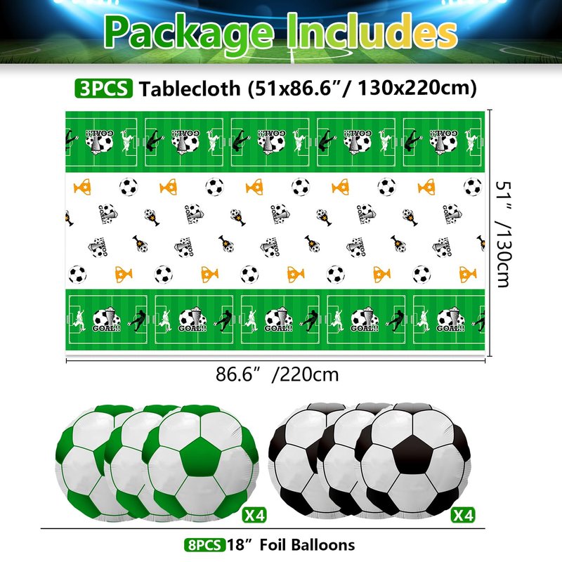 - Soccer Party Decorations Package Includes: 3 x soccer theme tablecloths(51x87"/130x220cm), the rectangular table cover is big enough for covering most table, 8 x soccer foil balloons(18 inches / 45cm).