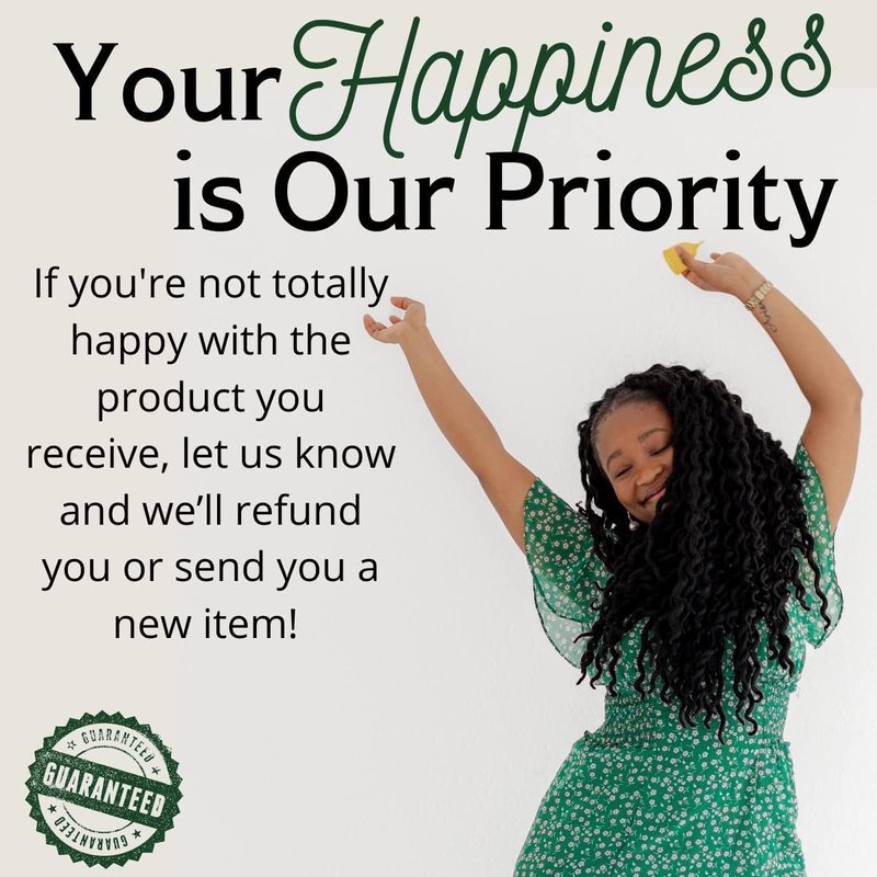 - 100% Happiness Promise. We are so confident that you’ll love our products that we back them all with our Happiness Promise. This means if you aren’t totally satisfied, we will make it right. Either a full refund or a replacement product. We’ve got you.