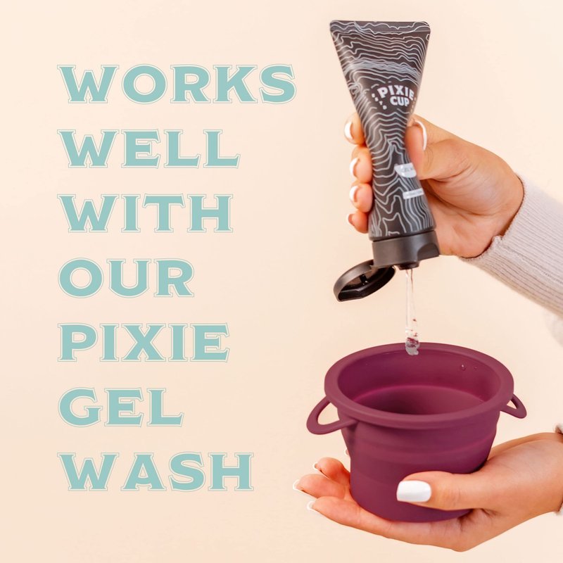 - Discreet. The Pixie Cup Sterilizing Container is great for a quick rinse in a public restroom. Fill with water, insert your menstrual cup and shake!