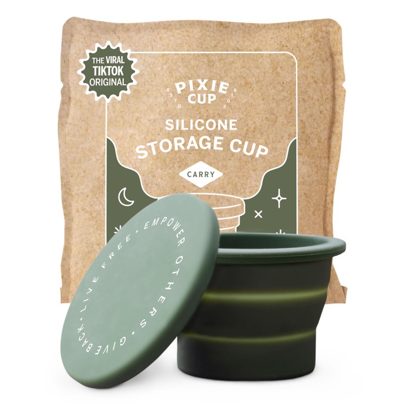 - Discreet. The Pixie Cup Sterilizing Container is great for a quick rinse in a public restroom. Fill with water, insert your menstrual cup and shake!