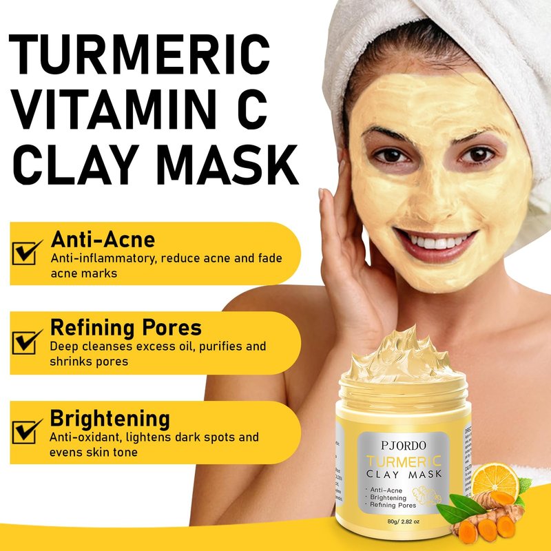 - Turmeric Vitamin C Clay Mask: This turmeric facial mask is rich in vitamin C, which effectively lightens dark spots, improves dullness, evens out skin tone and enhances skin radiance. A natural antioxidant that helps collagen production, slows skin aging, increases skin elasticity, and makes skin more delicate and firm. Effectively reduces acne, whiteheads and blackheads.