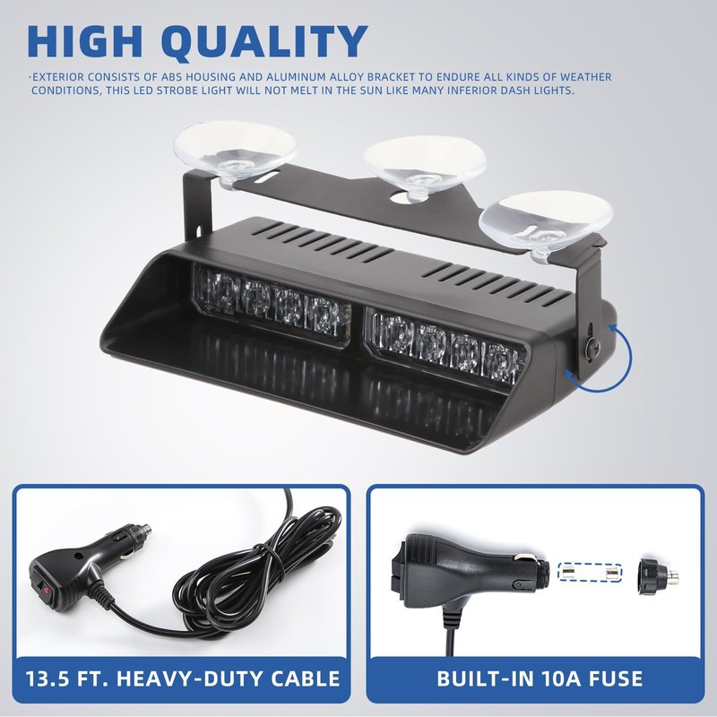 - HIGH QUALITY - Exterior consists of ABS housing and aluminum alloy bracket to endure all kinds of weather conditions, this LED strobe light will not melt in the sun like many inferior dash lights.
