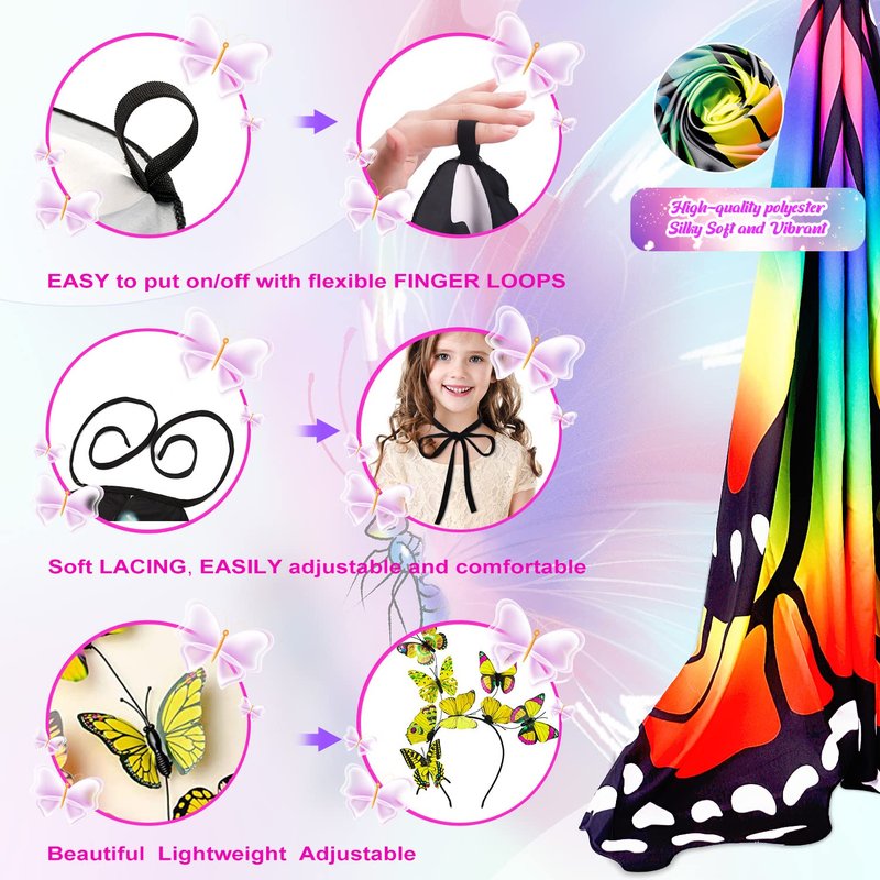 - 🦋 【 Perfect HALLOWEEN COSTUMES!】 - Our butterfly costume for girls are perfect for Halloween parties, Christmas, school performances, daily dress-up, role-playing, birthdays, dances, parades, festivals, and more. They make a great gift for children, allowing them to bring their dreams to life. Let your child shine in the Halloween spotlight with our wings shawl!