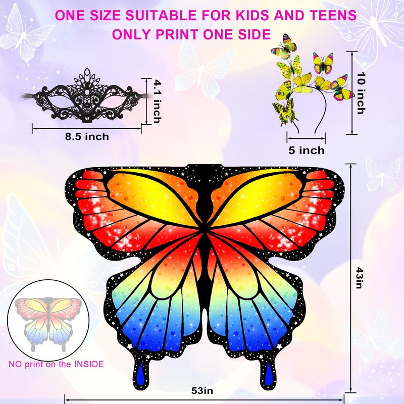 - 🦋 【WHIMSICAL DESIGN】 - Let your child's imagination soar with our butterfly wings. With bright colors and unique patterns, they'll instantly attract attention and transport your child into a magical world of color and wonder. Kids feel like a butterfly, flying into a wonderfully colorful fairy tale like magic world. SO much freeing and fun!!!