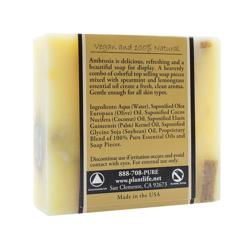 - Ambrosia: A deliciously refreshing soap that awakes your senses. A medley of our best selling vegan and cruelty-free soaps are chopped up and mixed in each batch.