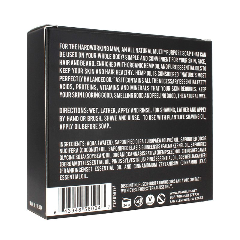 Plantlife's Man And Nature (MAN) All-N-1 soap is designed for the hardworking man; an all natural multi-purpose bar that can be used on your whole body! Simple and convenient for your skin, face, hair and beard. Enriched with organic hemp oil, considered to be “nature's most perfectly balanced oil,” to provide essential fatty acids, proteins, vitamins and minerals necessary for healthy skin. Made with all natural ingredients like essential oils, olive oil, and coconut oil, no hidden chemicals or synthetics. Keep your skin looking good, smelling good and feeling good, the natural way!