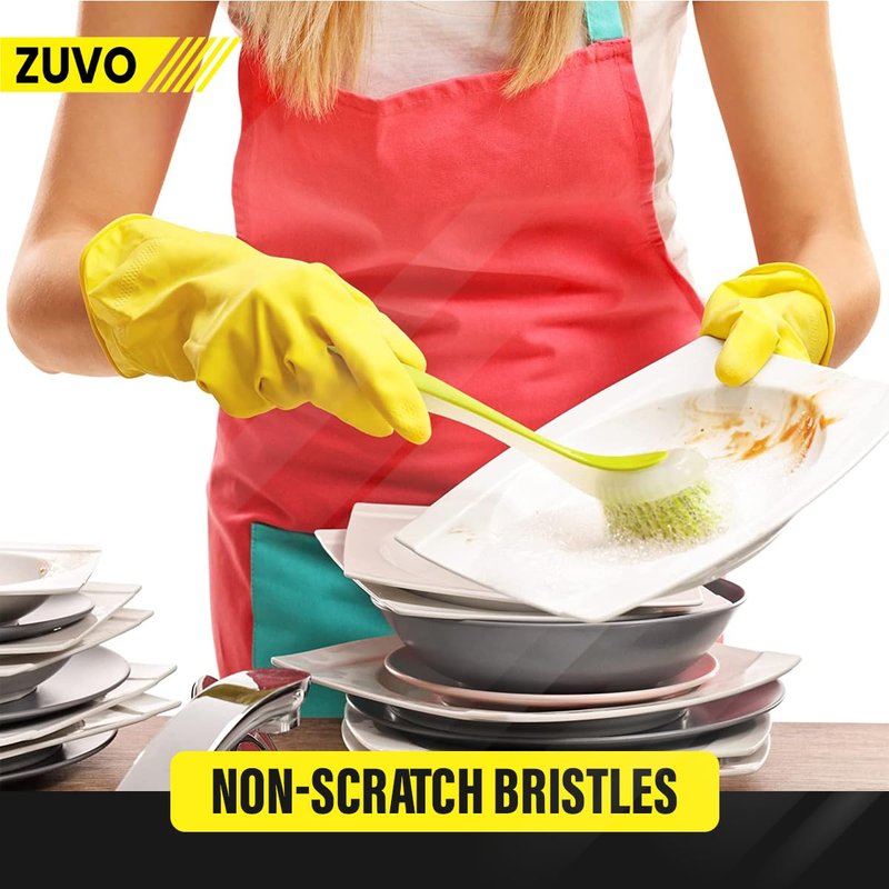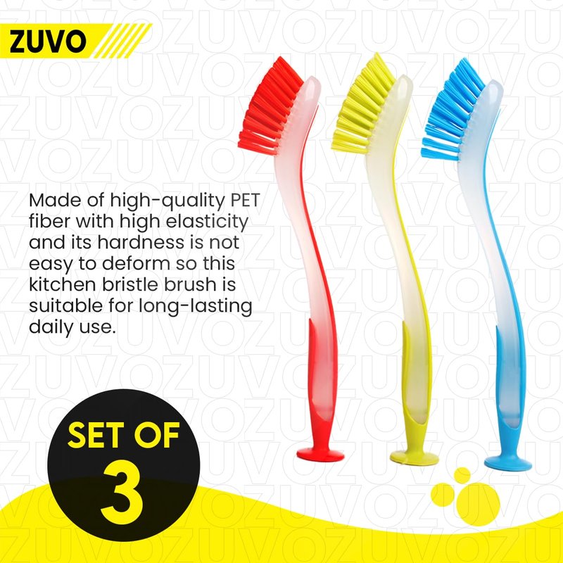 Zuvo's kitchen cleaning brush sets are great for cleaning pots, pans, kitchen sink bathroom, etc. The PET fiber bristles are high elasticity and durable material which provides the long-lasting life of the brush. Ergonomically curved shaped long handle fits perfectly in the hand, makes it easy to apply pressure while scrubbing. Features: Made with the PET fiber Soft long curved handle Dishwasher Safe Suction base for standing on a flat surface Perfect for pots, pans, kitchen sink bathroom Comes with Set of 3