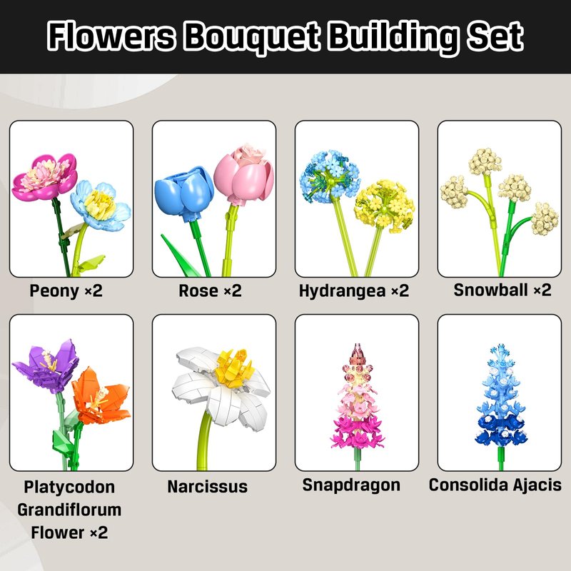 - VIVID FLOWER BOUQUET - PLAXSOON Flower Bouquet Building Set features 13 colorful flower stems with 8 different varieties, including peony, rose, hydrangea, platycodon grandiflorum flower, snowball, narcissus, snapdragon and consolida ajacis. Each flower in the building set is intricately detailed, with vivid colors and elegant designs, that will add sparkle and vitality to your home(Please note: vases are NOT included)