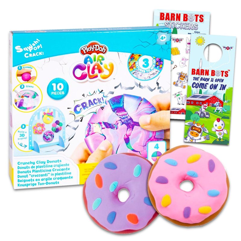 - Officially licensed Play-Doh Crunchy Clay Donuts craft kit for kids also includes Barn Bots stickers and a Barn Bots door hanger.