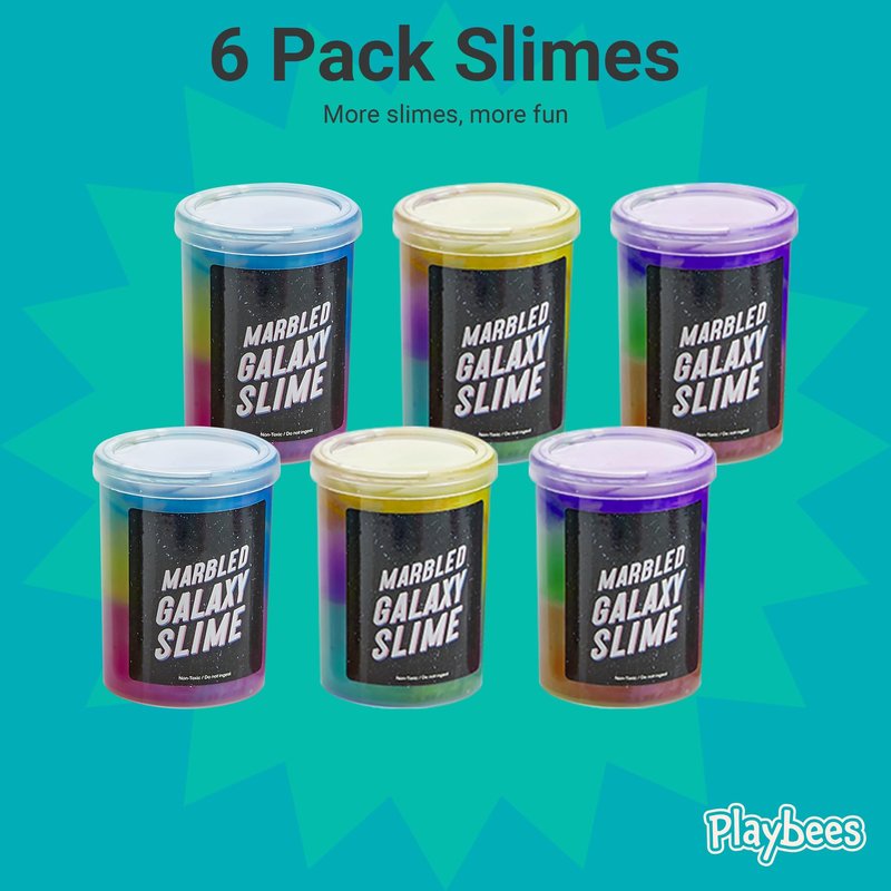 - Galaxy Enchantment: Delve into cosmic delight with Playbees Galaxy Slime! This 6-pack features outer space designs in compact cups, each containing enchanting starry night-colored slime.