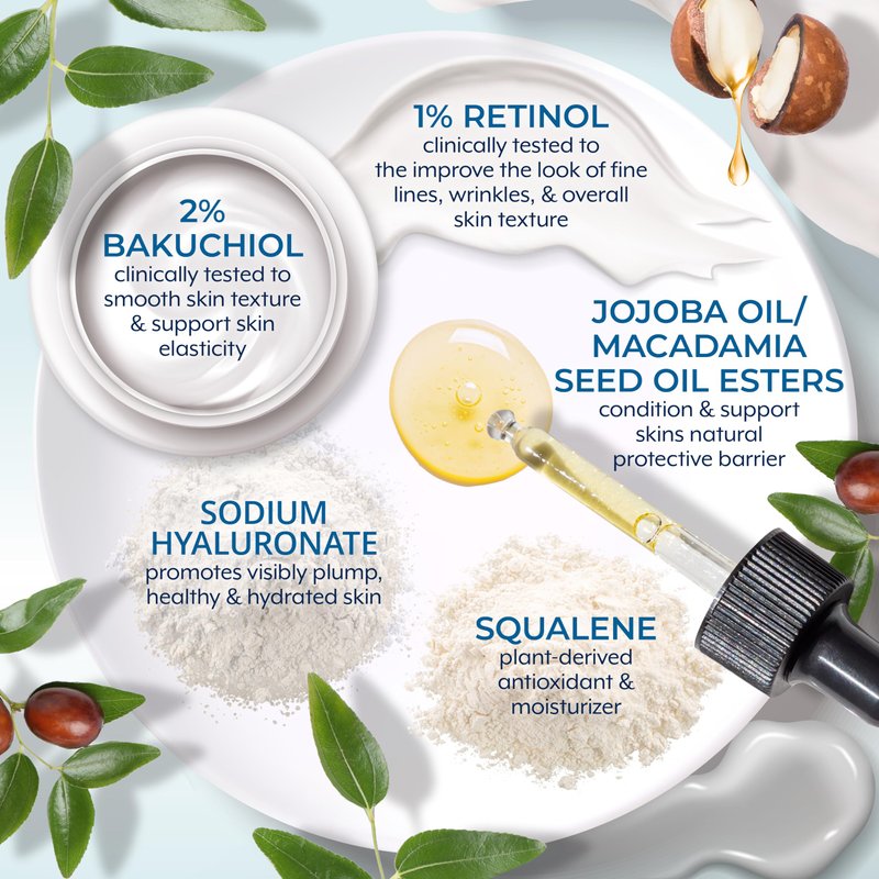 - Ingredients: Purified Water, Propanediol, C13-15 Alkane, Bakuchiol, Sodium Hyaluronate, Retinol, Jojoba Oil/Macadamia Seed Oil Esters, Squalane, Phytosterols, Tocopherol, Betaine, Phytosteryl Macadamiate, Hydroxymethoxyphenyl Decanone, Caprylic/Capric Triglyceride, Arachidyl Alcohol, Behenyl Alcohol, Hydroxyethyl Acrylate/Sodium Acryloyldimethyl Taurate Copolymer, Arachidyl Glucoside, Lecithin, Acrylates/C10-30 Alkyl Acrylate Crosspolymer, Phenoxyethanol, Ethylhexylglycerin