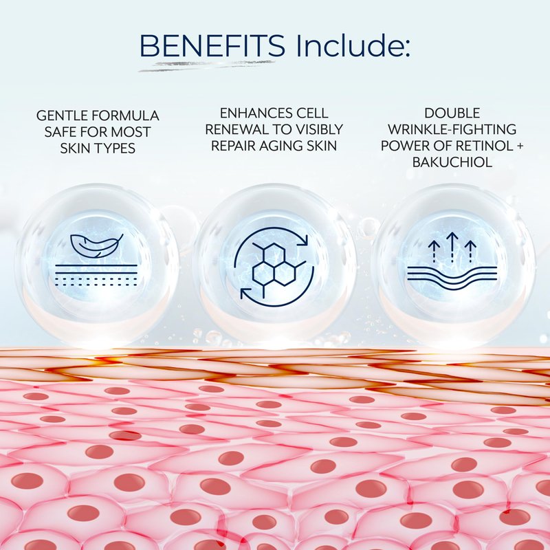 - 2X WRINKLE FIGHTERS: Powerful formula combines the wrinkle fighting effects of two proven anti-aging and clinically tested ingredients, 1% Retinol and 2% Bakuchiol. Helps improve visible signs of aging for smoother, more radiant looking skin.