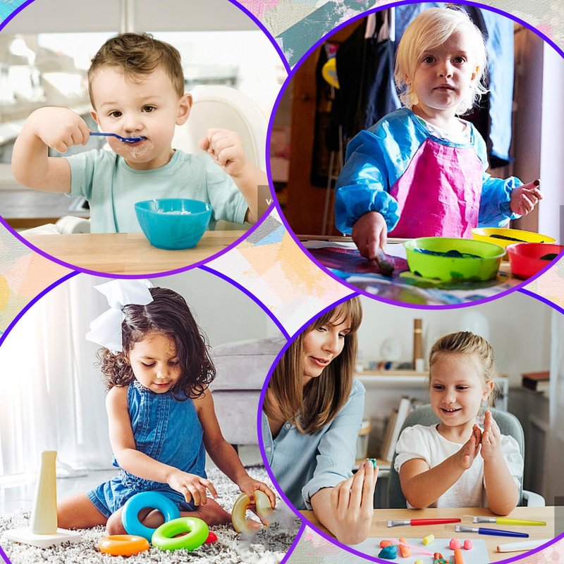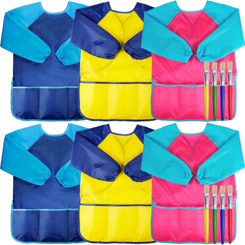 - Kids Art Smock with Paint Brushes: This set includes 6 toddler art smocks (paints not included) and comes with 8 paintbrushes, 4 round and 4 flat with colorful handles.
