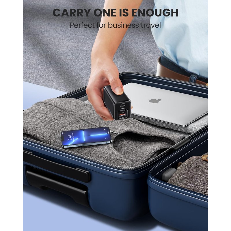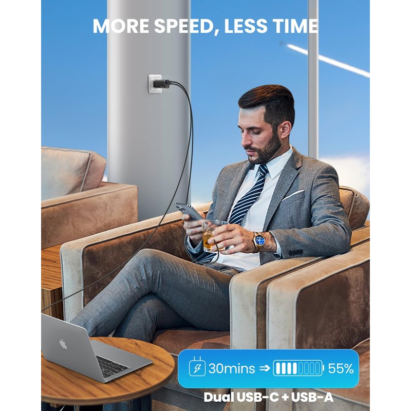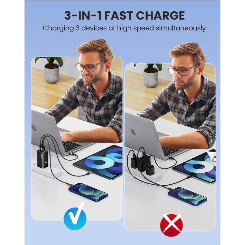 - 【3-in-1 Dual USB C Charger】: The fast charger Comes with 2 USB C(PD3.0, 65W Max) and USB A (QC4.0, 30W Max) . 3-port output can simultaneously charge multiple devices at the same time. So you only need to bring the charger instead of 2-3-4. Portability Handy for travel、home office and on-the-go charging. when you connect three devices, power will be distributed efficiently between ports to ensure you get a better charge.