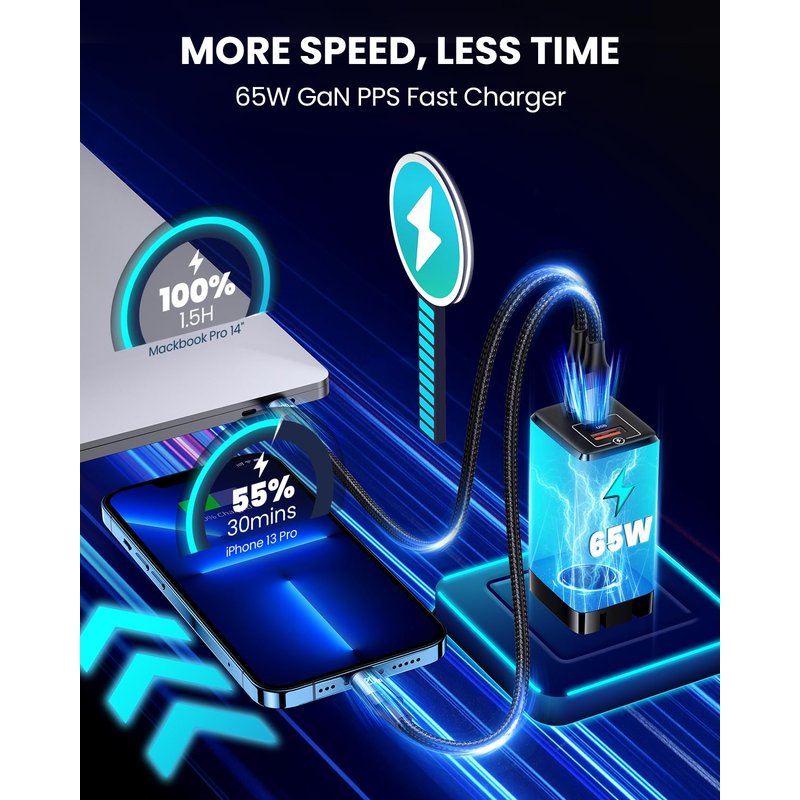 - 【65W Super Fast Charging】The 65W USB C Charger provide PD3.0 and QC4.0 high efficiency to charge your phone, tablet, and laptop. 65W max output, it can meet the need of high speed charging. Only 1.5 hours to fully charge your MacBook Pro 15.4'', takes 30 min to charge iPhone 13 Pro Max to 64%/Samsung S22 Ultra to 65%, 4x faster than the original 5W charger. The fast charger can ensure it charges correctly as long as you use high quality matching cords.