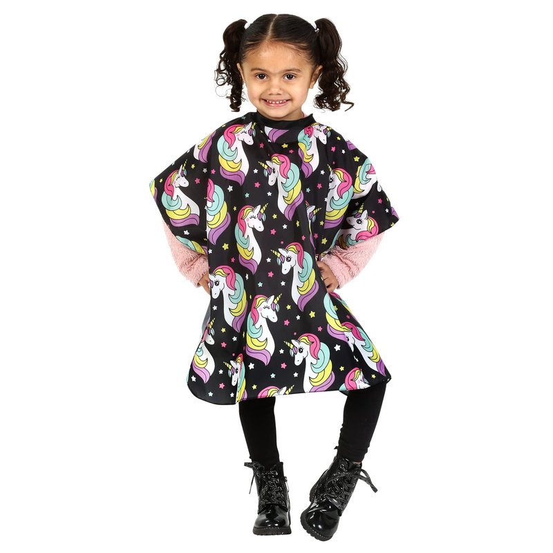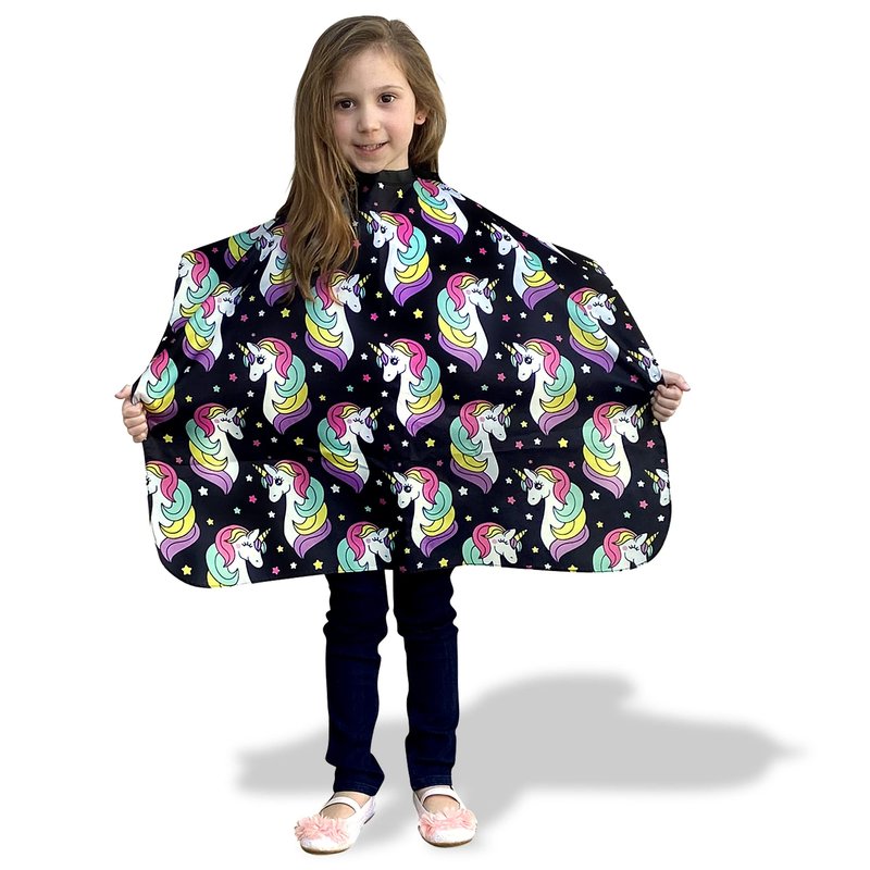 Everyone loves unicorns and this delightful cape will make haircuts more fun! Use for home hair cuts or for your professional salon or barber shop. This hair cutting cape is adjustable with the plastic snaps and will fit a range of kids from toddlers to young girls and boys.This cape is long enough to hang over the back of the chair at the salon and long enough to hang over their legs. The cape is 27 inches wide and 36 inches long. This water resistant cape will keep their clothes dry and hair free while they get their routine haircut. Even if your kids don't like getting their hair done, this cape is a bright and colorful pattern that will make them feel more excited and comfortable at the salon. If you do your child's hair at home, this lightweight came will make clean up a breeze. The unicorn design is fun and colorful and will catch any kid's eyes. Make haircuts feel like less of a chore by adding fun patterns and colors to your salon. This is a great accessory to add to your station.