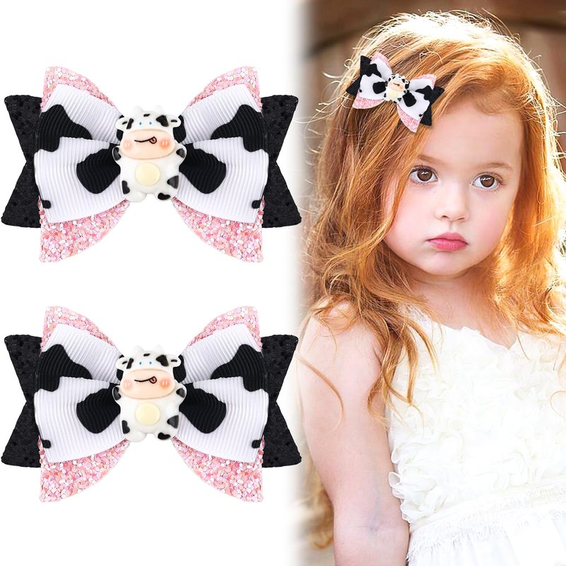 PLwelth 2Pcs Cow Print Hair Bow Clips for Girls Toddlers Cute Moo Cow Hair Barrettes Pink Cow Bow Hairpins Non Slip Bow Hair Clips for Theme Birthday Party Dress Outfit Costume Decoration Accessories