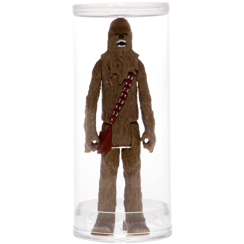 These action figure tubes are made from extruded plastic. They are a thick, flexible tube with a hard bottom and a removable hard acrylic cap. The cap can be used as the top or bottom of the display. Sizes listed are interior dimensions.