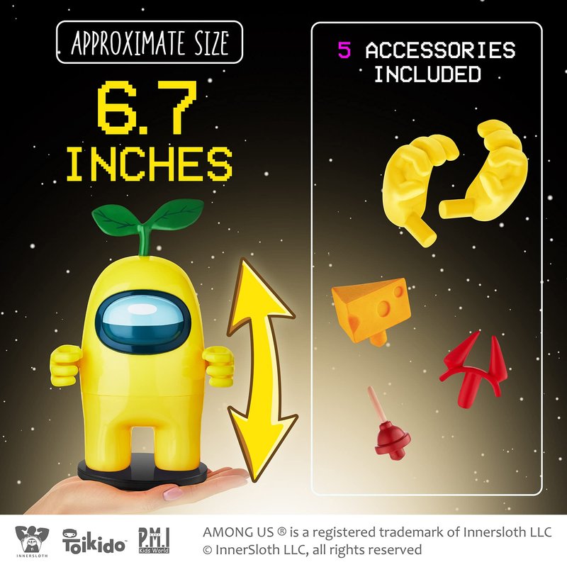 - GENUINE AMONG US TOYS LICENSED BY THE GAME’S DEVELOPERS. P.M.I., the manufacturer of these kids’ toys, is licensed by InnerSloth, the company that created AmongUs. These Among Us toys are authentic-looking and in line with the game’s original style. Minimalistic as they are, these action figures show the producer’s great attention to detail, like the 5 hidden accessories included in the box. Spark your children’s interest in the game, or reward them if they’re already Amung Us fans.