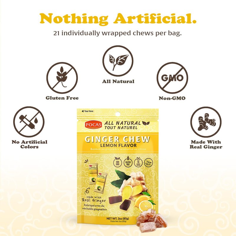 Pocas Lemon Ginger Chews - Sweet and Zesty Ginger Chew, Individually Wrapped Low-Calorie Snacks, Ginger Candy Made with Pure Cane Sugar, 3 Oz Ea (Pack of 4)