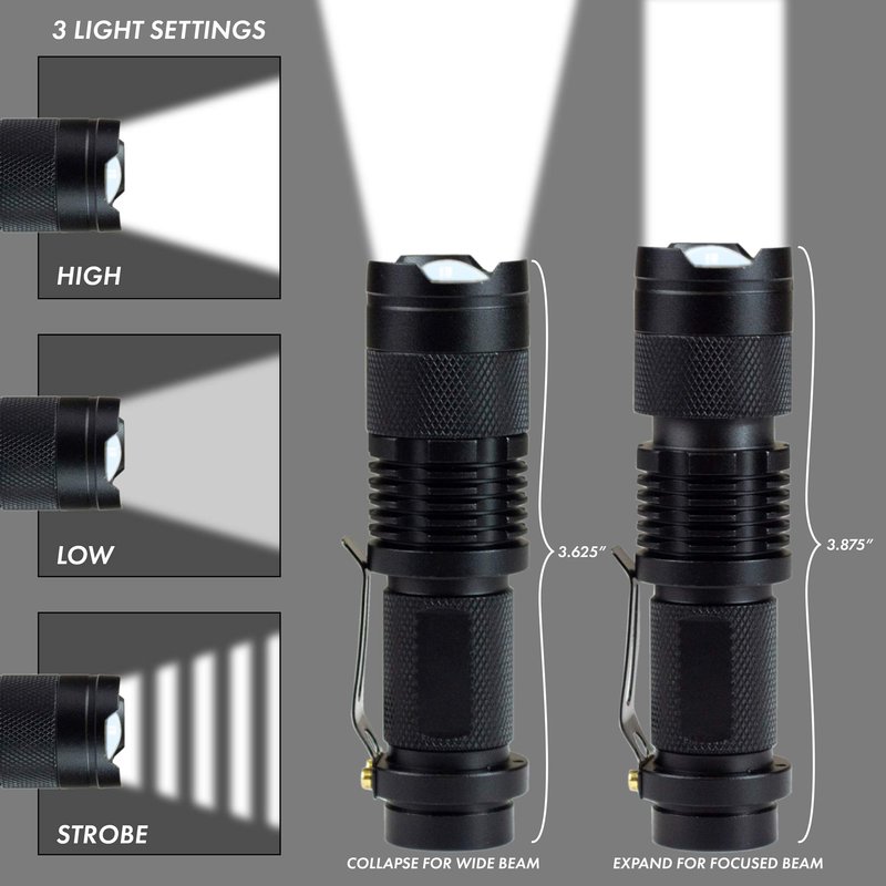 Ultrabright Pocket CREE Mini LED Flashlight: With 3 modes (bright, dim, and strobe/SOS) you will have access to the amount of light you need for any situation. You can focus the beam of light, and it has an attached clip to keep it from rolling away.