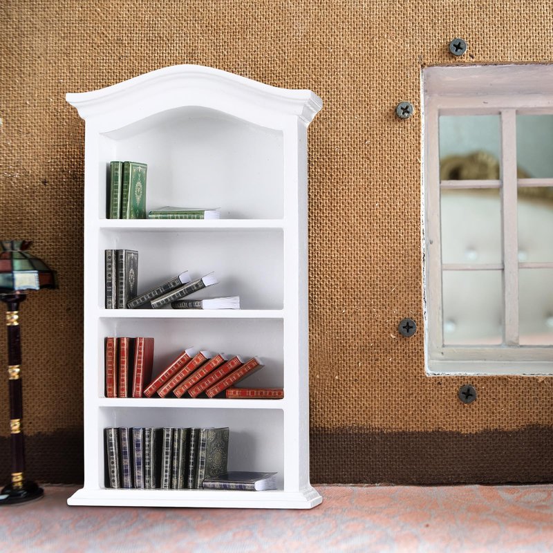Poen 27 Pcs 1: 12 Scale Miniatures Dollhouse Books and a Wooden Bookcase Dollhouse Decoration Accessories 1: 12 Dollhouse Miniature Furniture 4 Floors Dollhouse Bookshelf for House Bedroom, White
