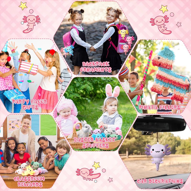 - Adorable Sleepover Party Favor Supplies for Girls: every glance at these stuffed animal salamanders reveals a world of charm; From their endearing expressions to their furry tentacles, tails, and petite limbs, their delightful design is bound to win the hearts of boys, girls, and axolotl enthusiasts alike
