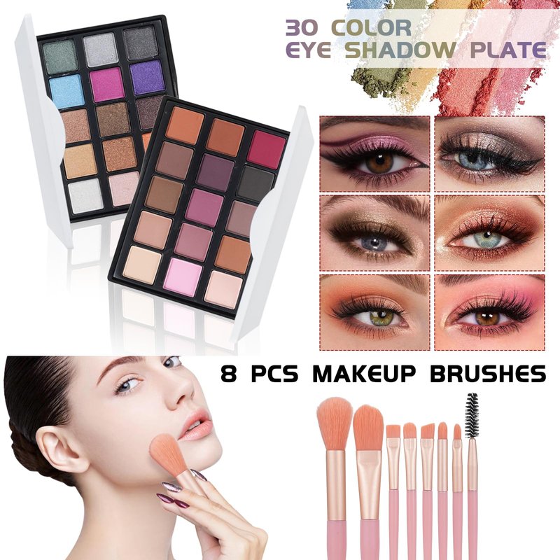 - The Makeup kit Gift Set including 2*15 color eyeshadow palette,Concealer,Mascara,Lipgloss Set,Eyebrow Pencil,Eyeliner,Powder Puff,Makeup Brushes,15 Colors Concealer palette, Makeup Bag